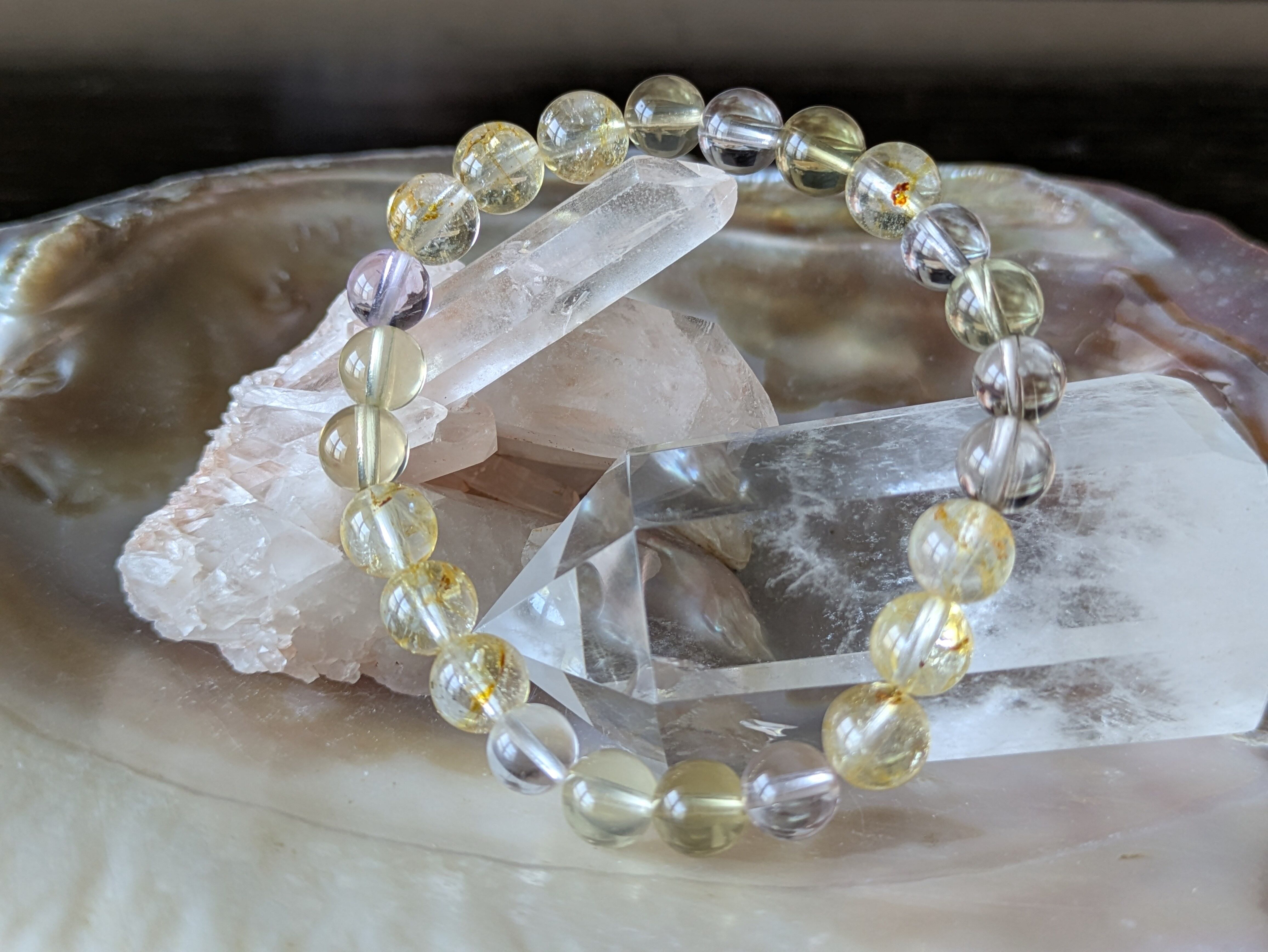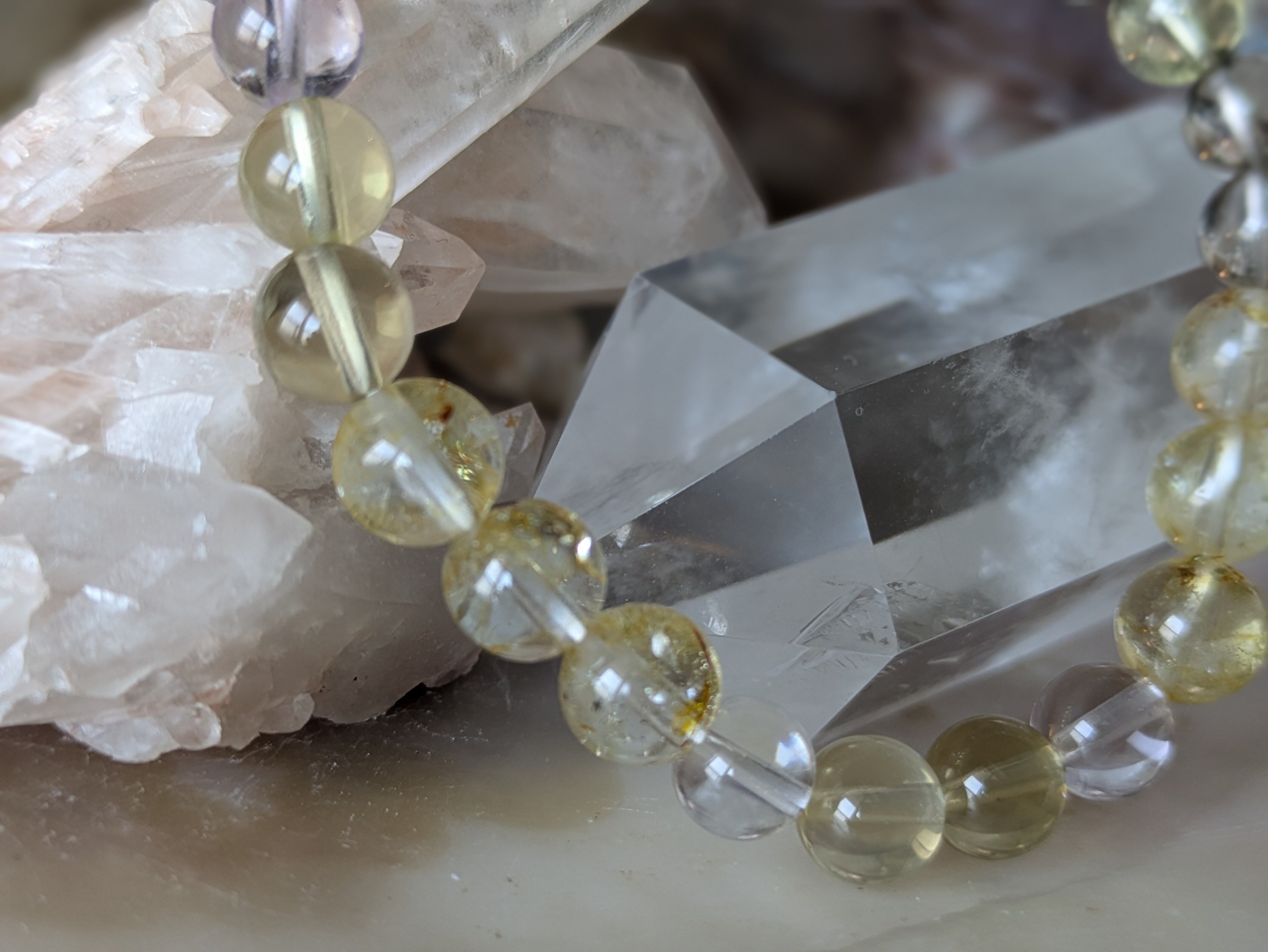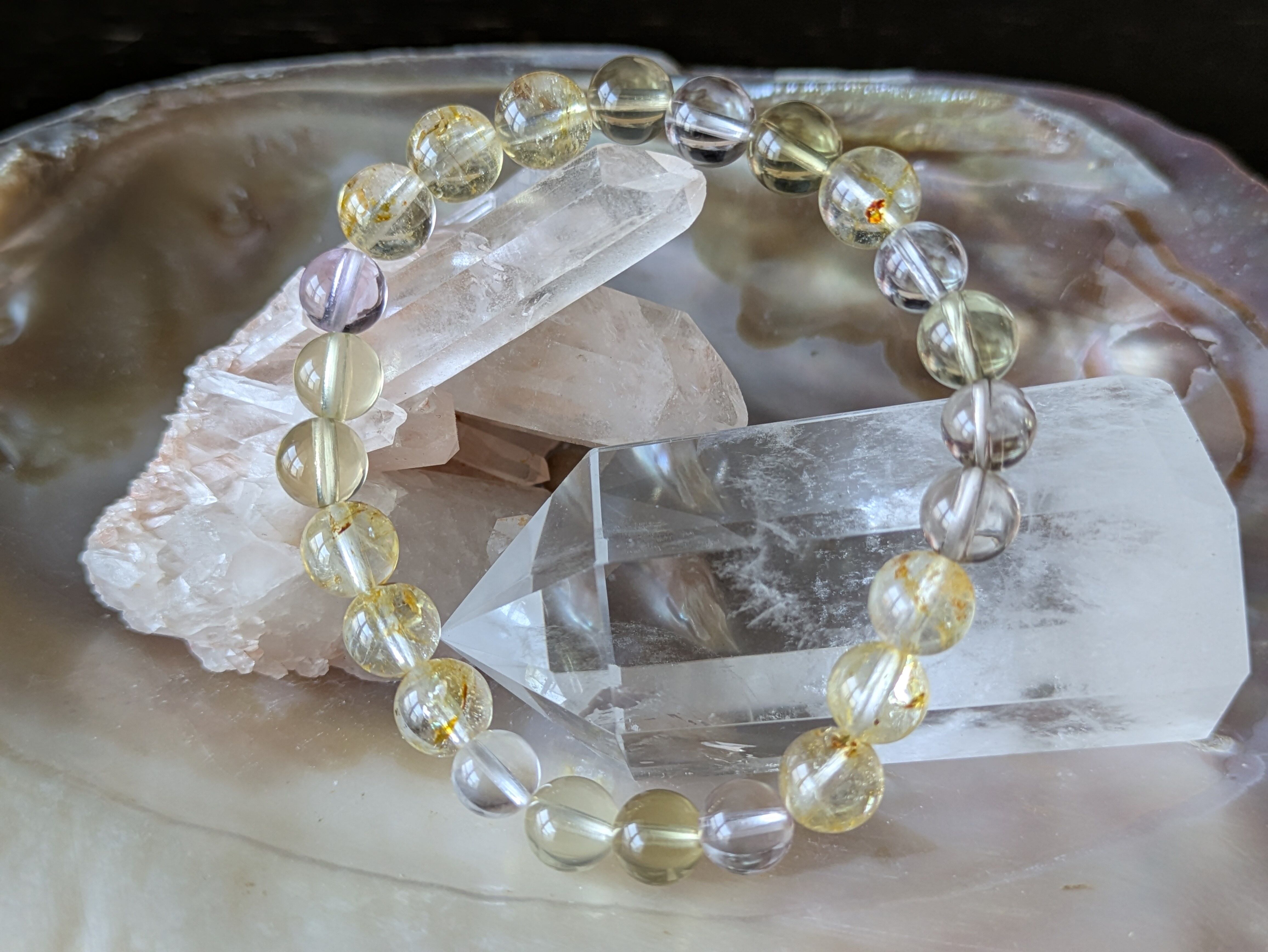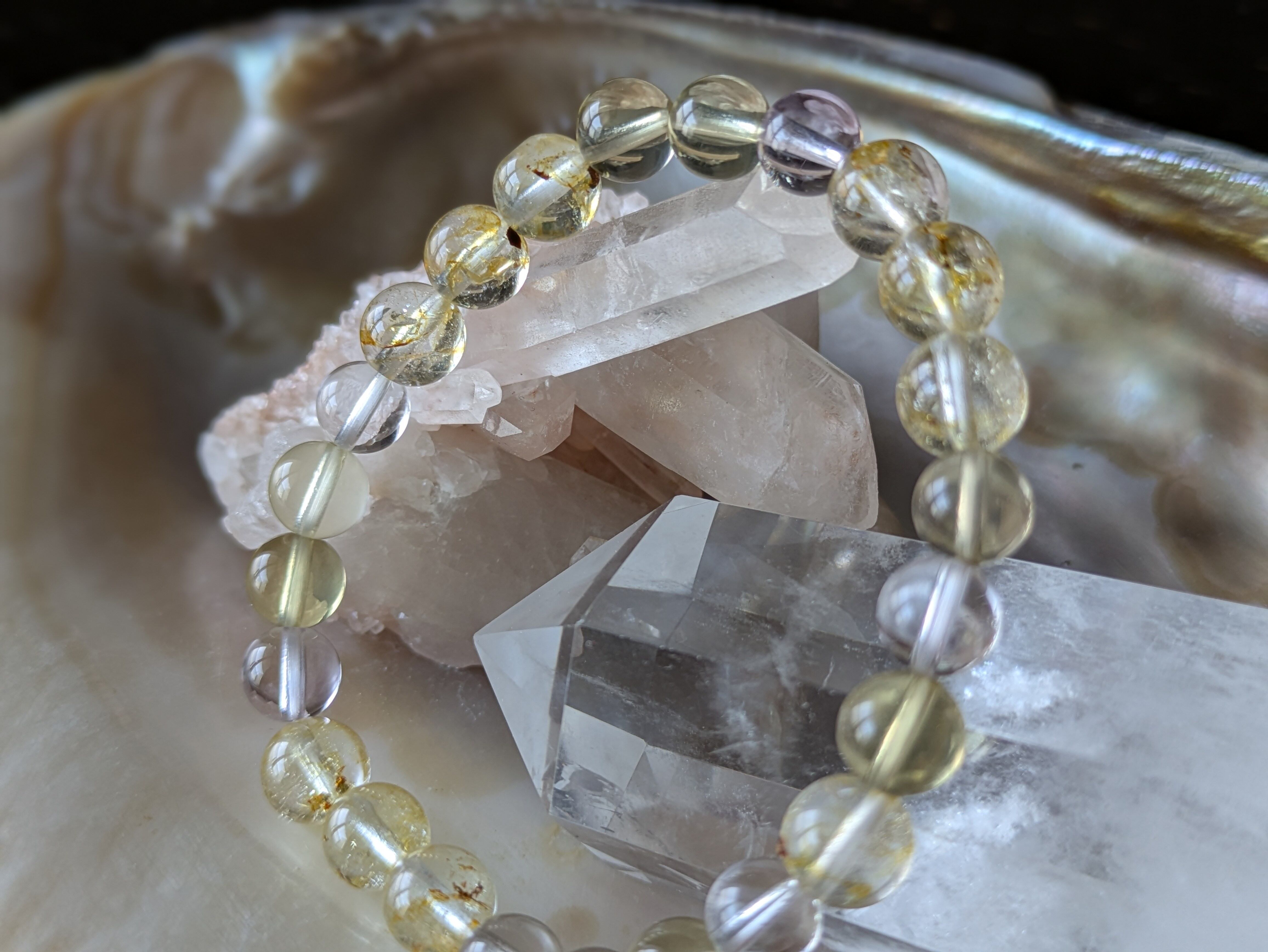 透明感のある水晶や魅力的なレモンクォーツ、落ち着いたスモーキークォーツが織りなすハーモニーは、日常生活に色彩と豊かさを加えます。持つことで、心の安定とポジティブなエネルギーを引き寄せる手助けをします。