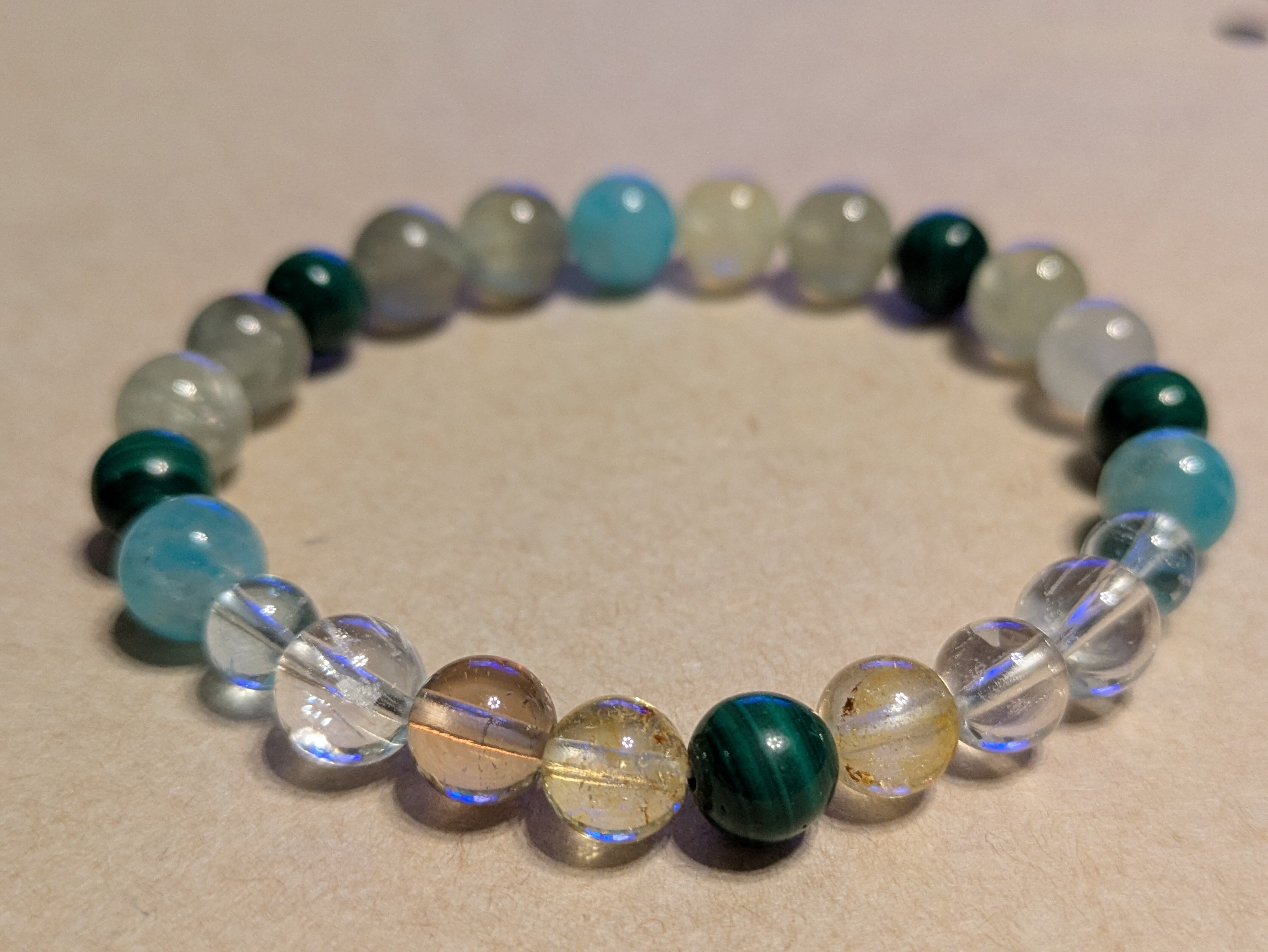 ★このブレスレットは、マラカイト、アマゾナイト、プレナイト、ミックストパーズという4種類の天然石が絶妙に組み合わさり、身に着けることで魅力を引き立てるお手伝いをします。