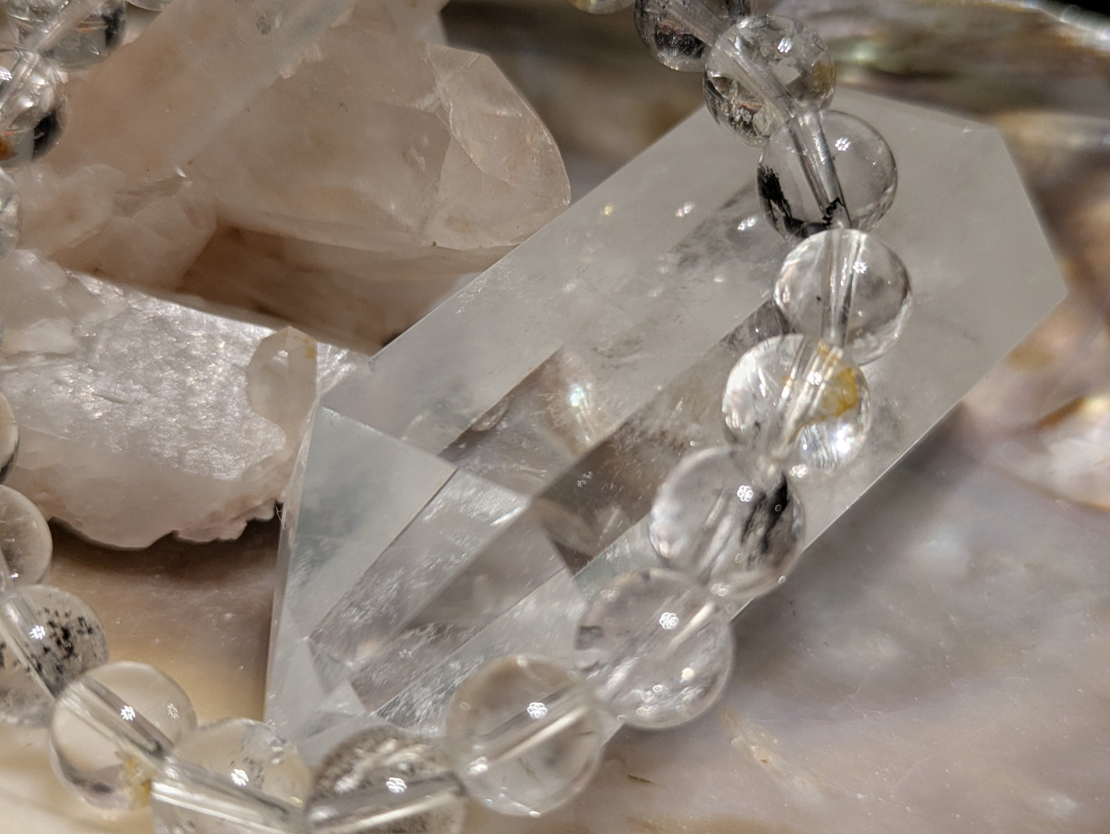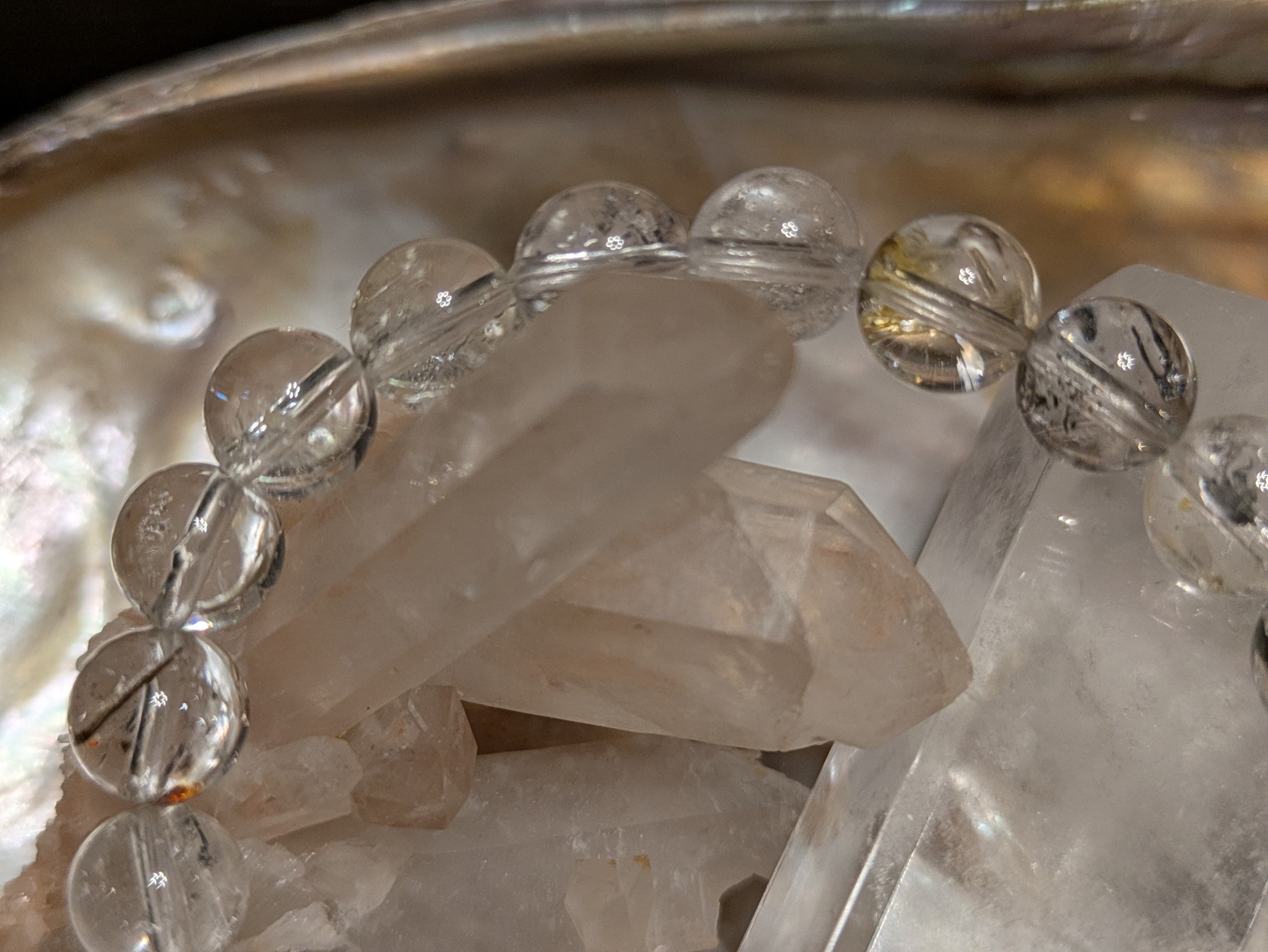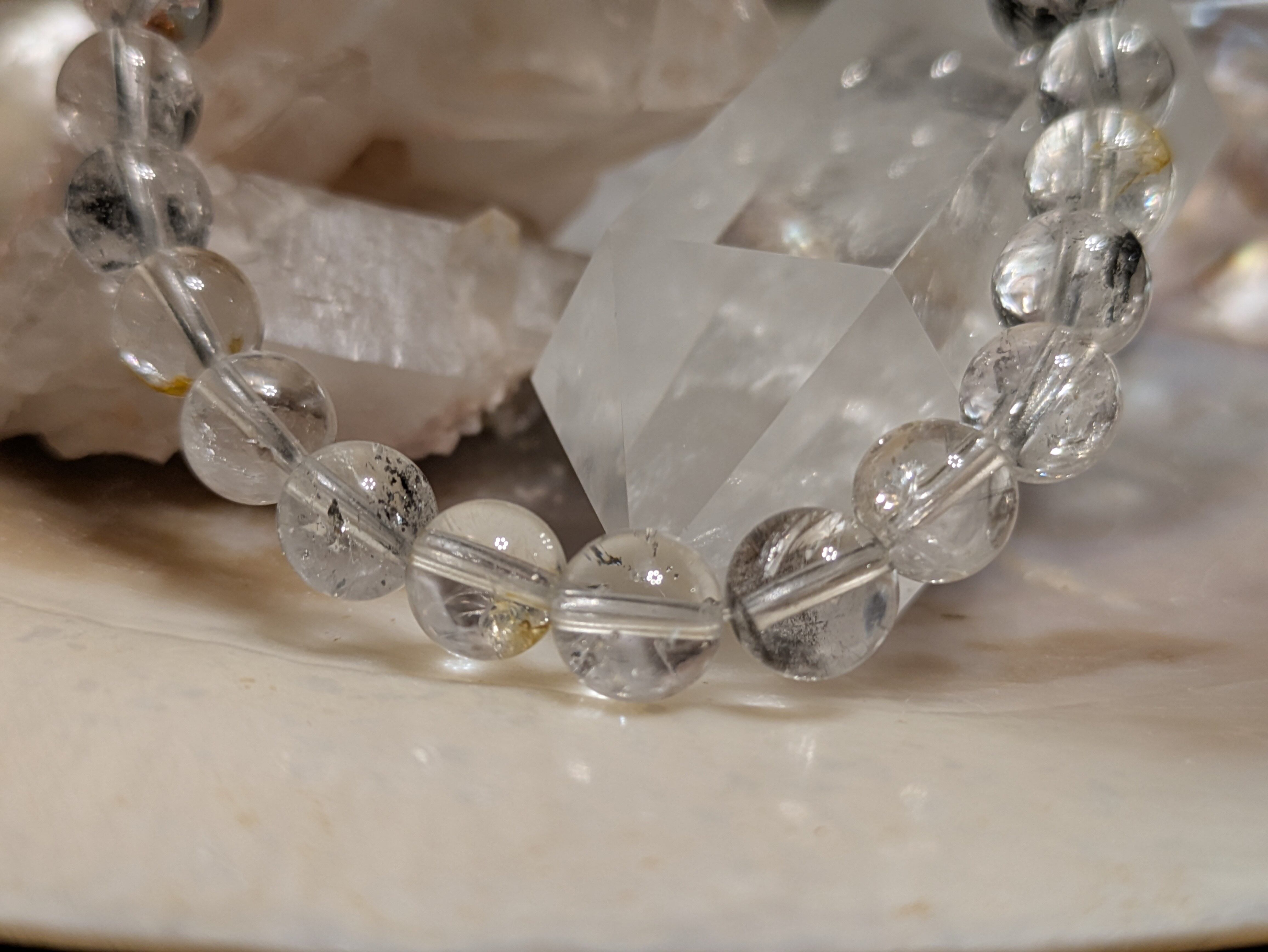 ■エレスチャルクォーツ…この石は、持つ人に深遠なエネルギーを伝え、内面的な成長を助けます。一つ一つ異なる質感や模様があり、見る人を魅了します。