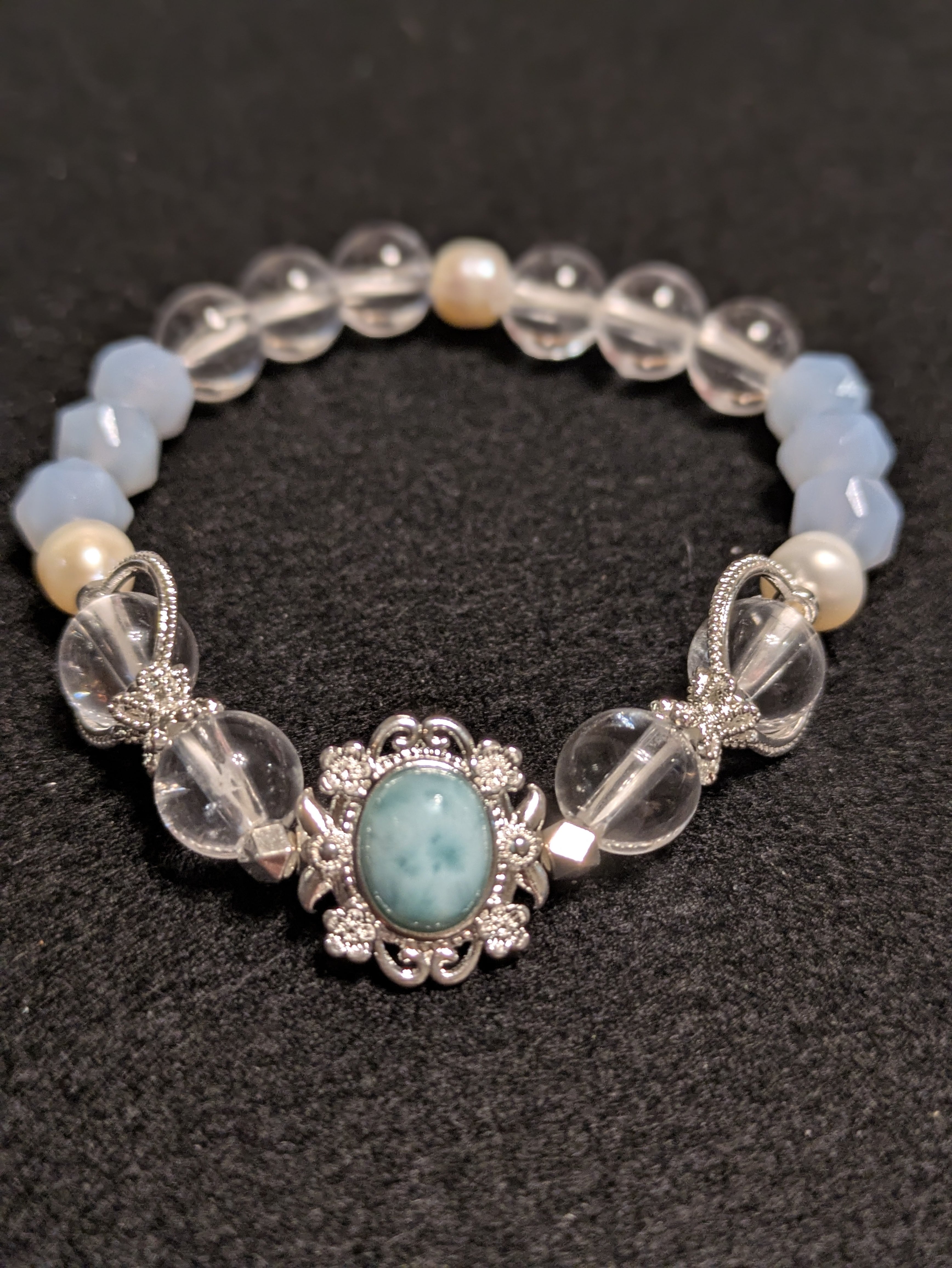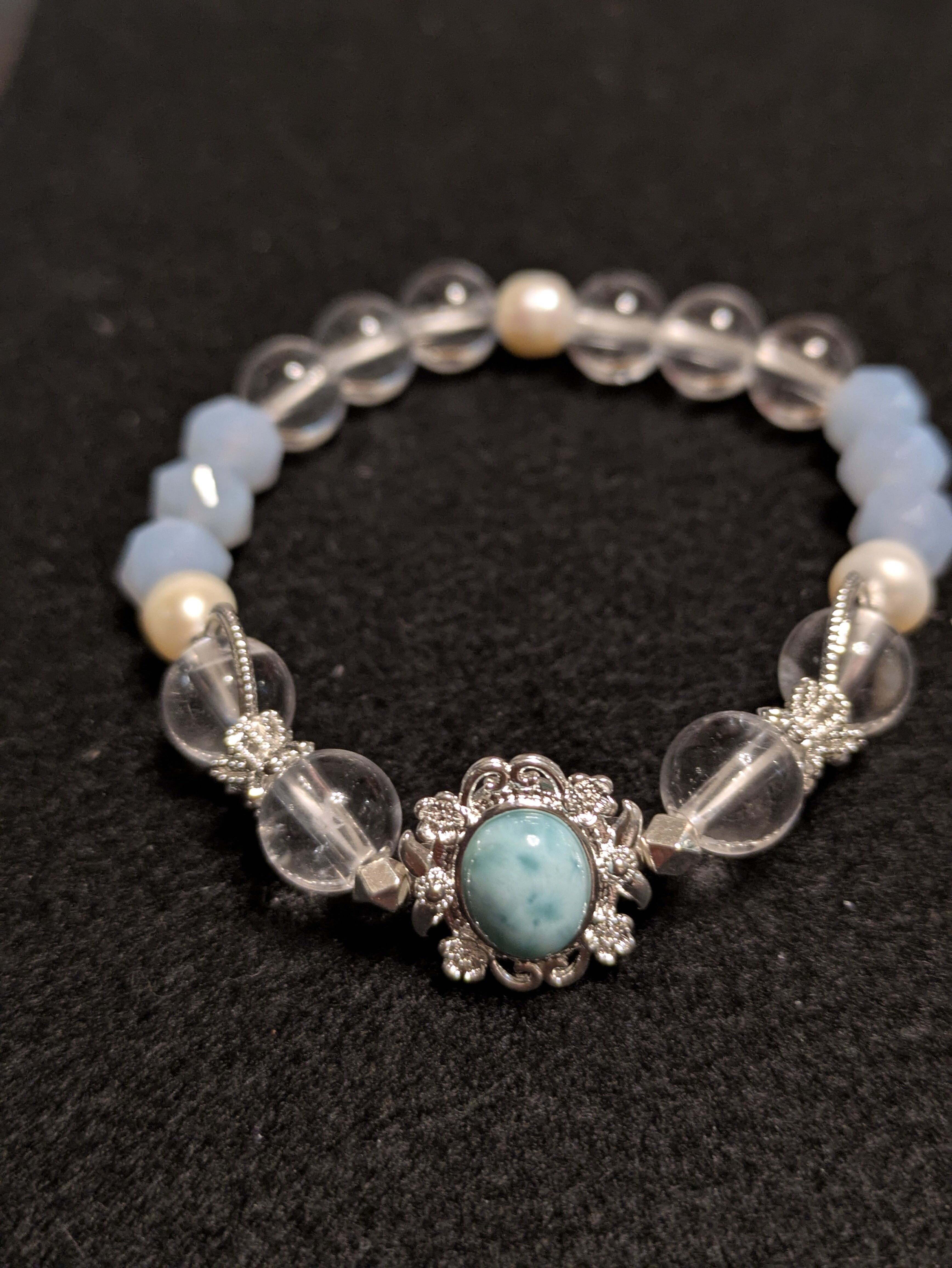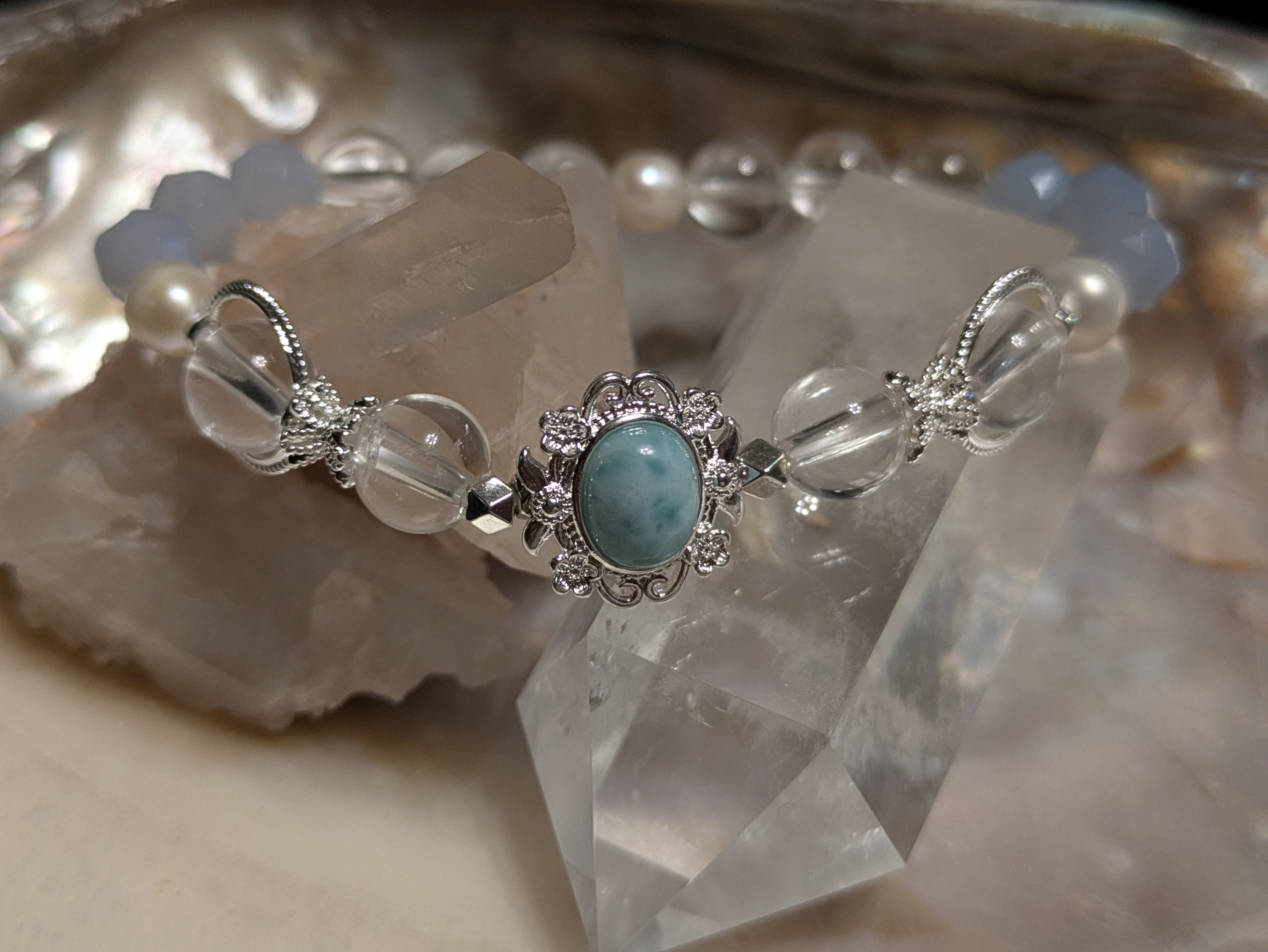 ■ラリマー、水晶、ブルーレースアゲート、淡水パール、真鍮が組み合わさった美しいブレスレットです。
