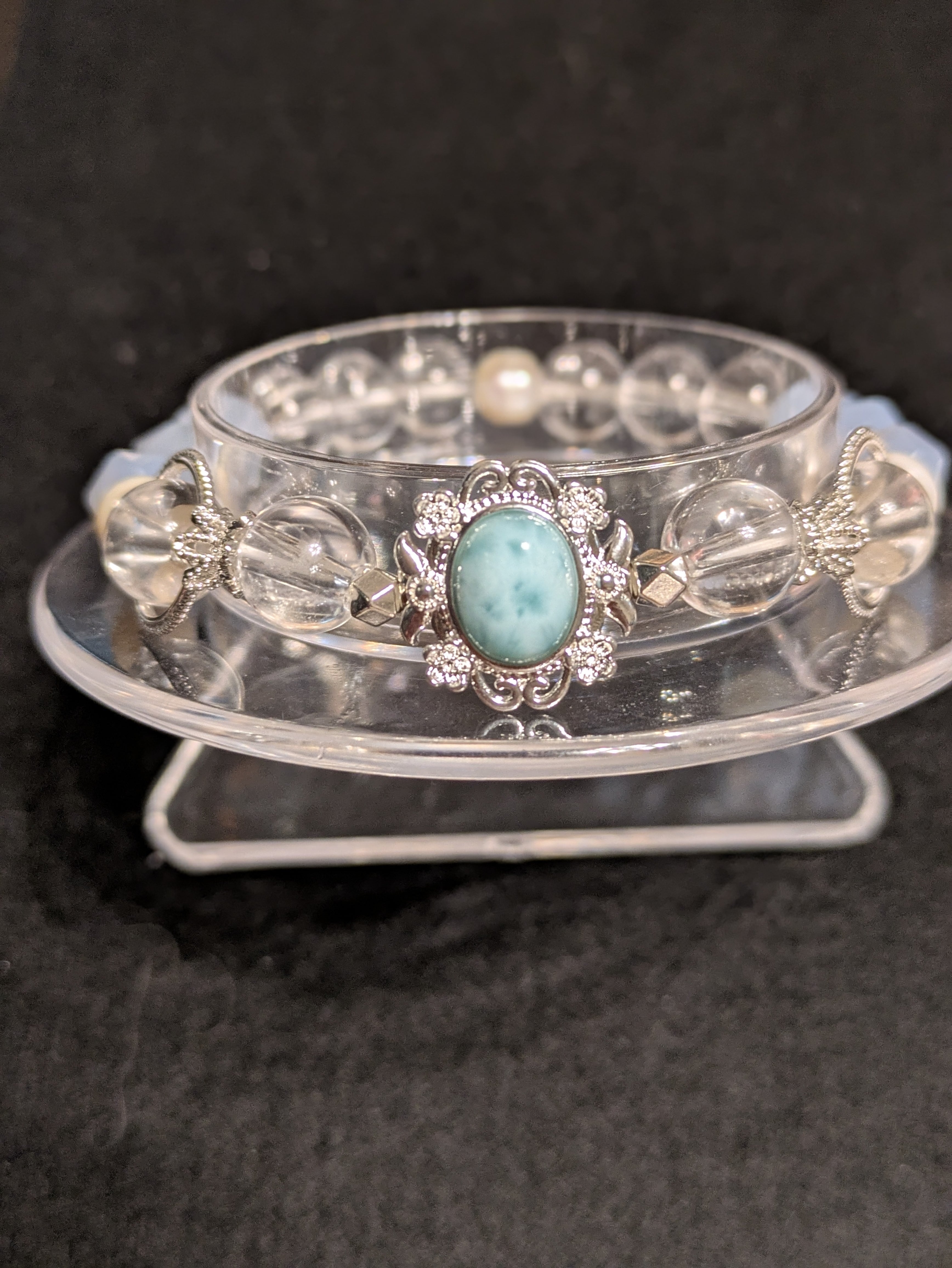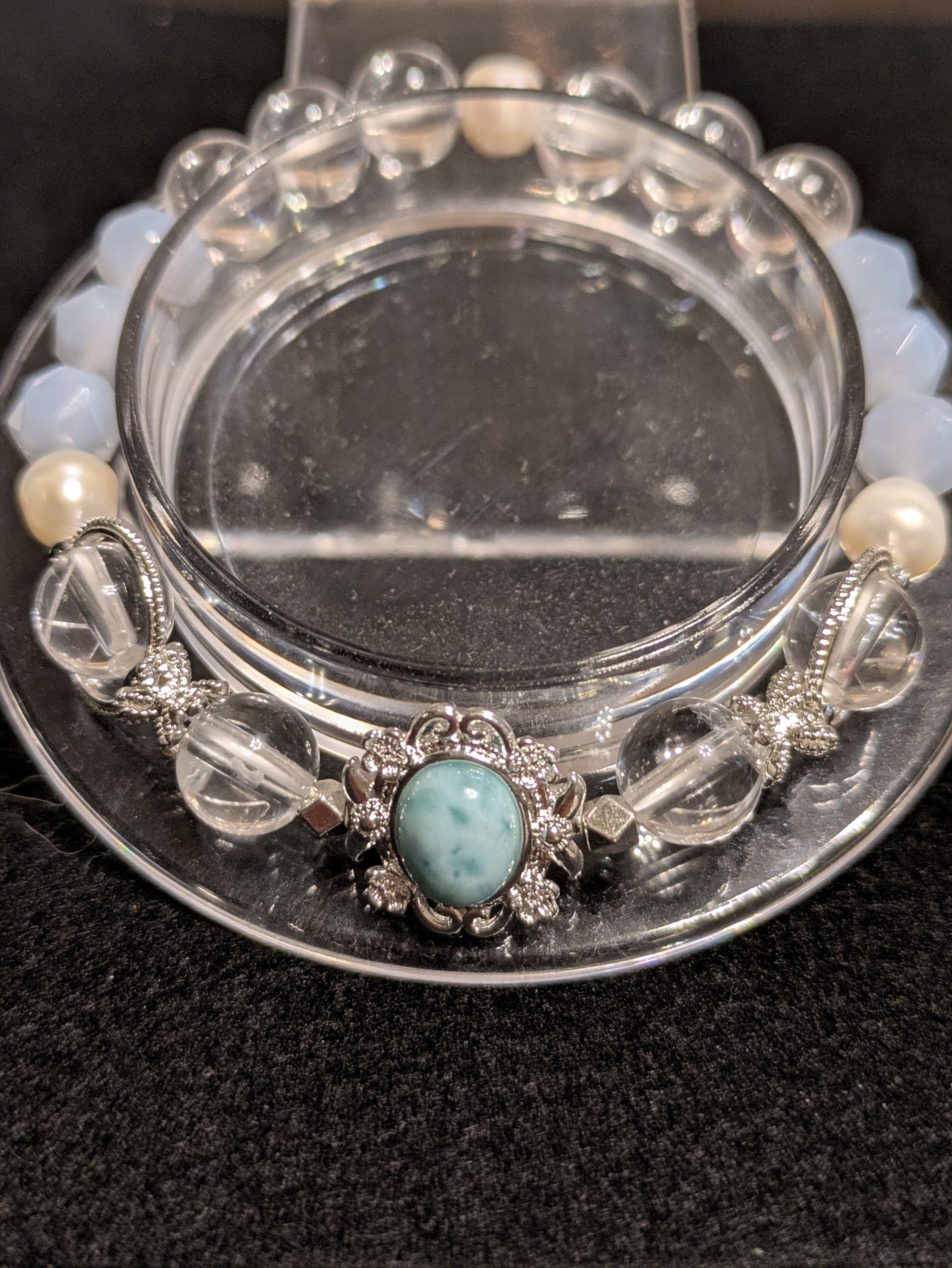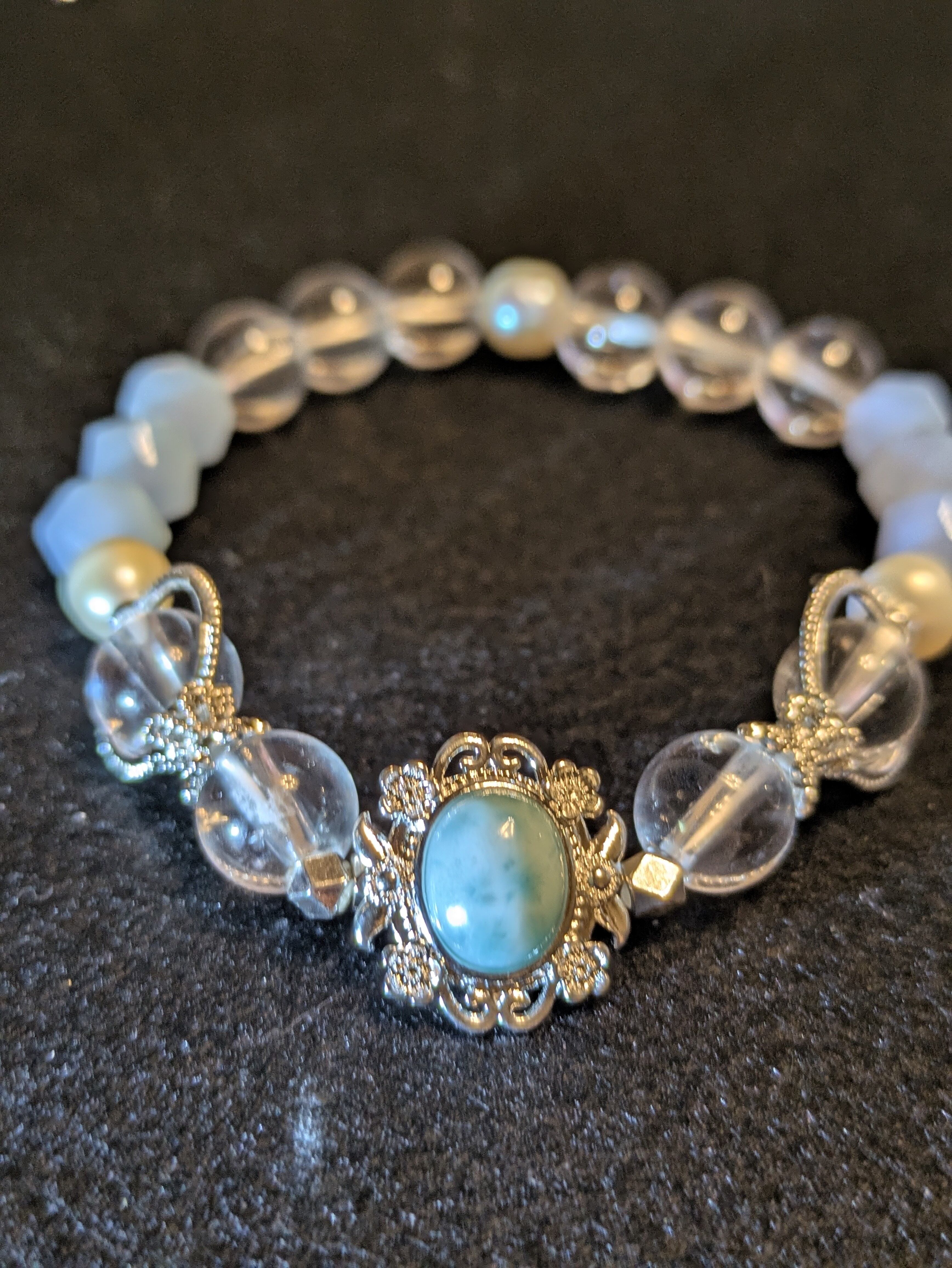 ■ラリマー、水晶、ブルーレースアゲート、淡水パール、真鍮が組み合わさった美しいブレスレットです。