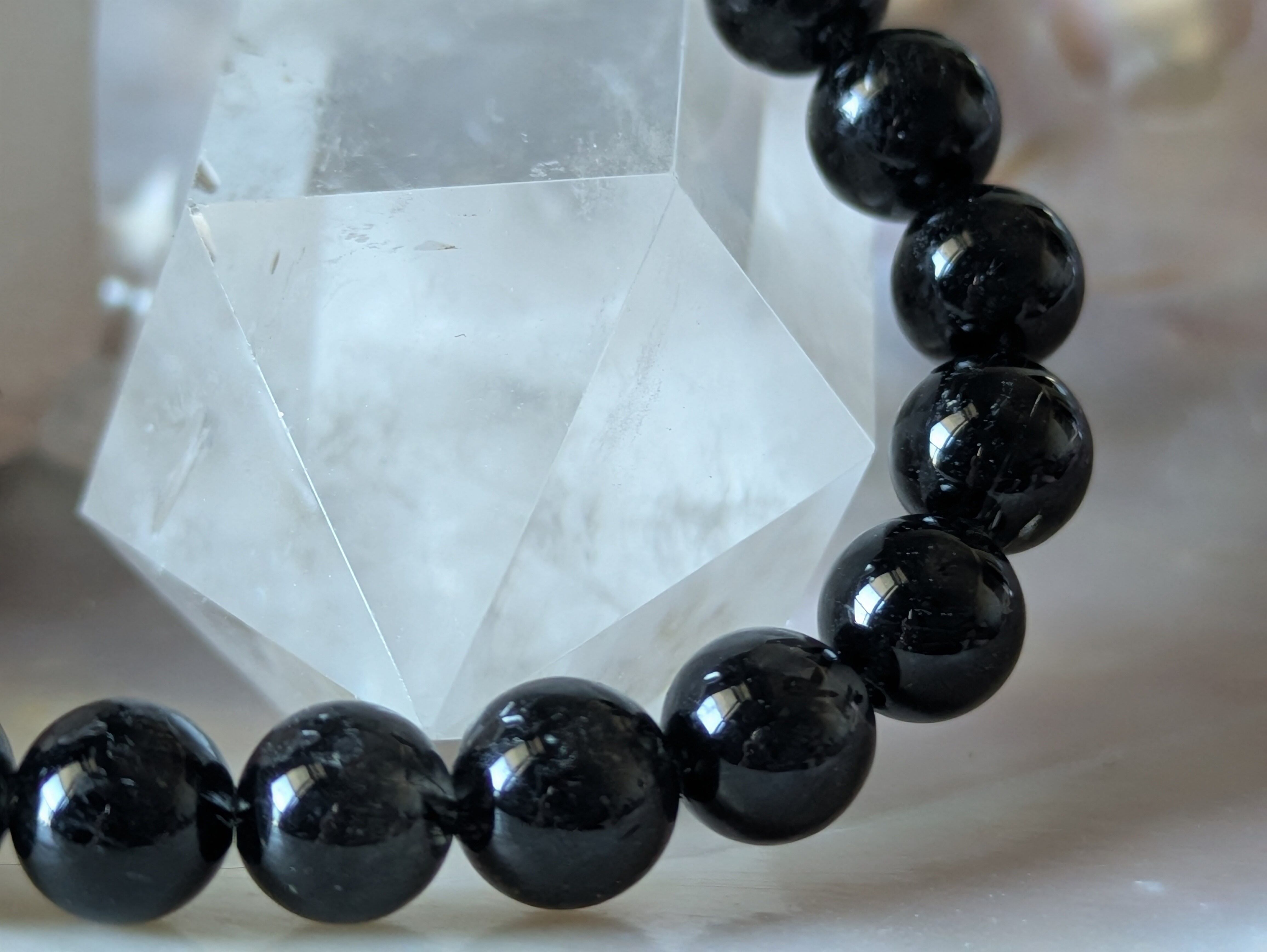 神秘的な光沢と深い色合いが特徴のブラックルチルクォーツ。美しい針状のルチルが内部に存在し、見る者を惹きつけます。