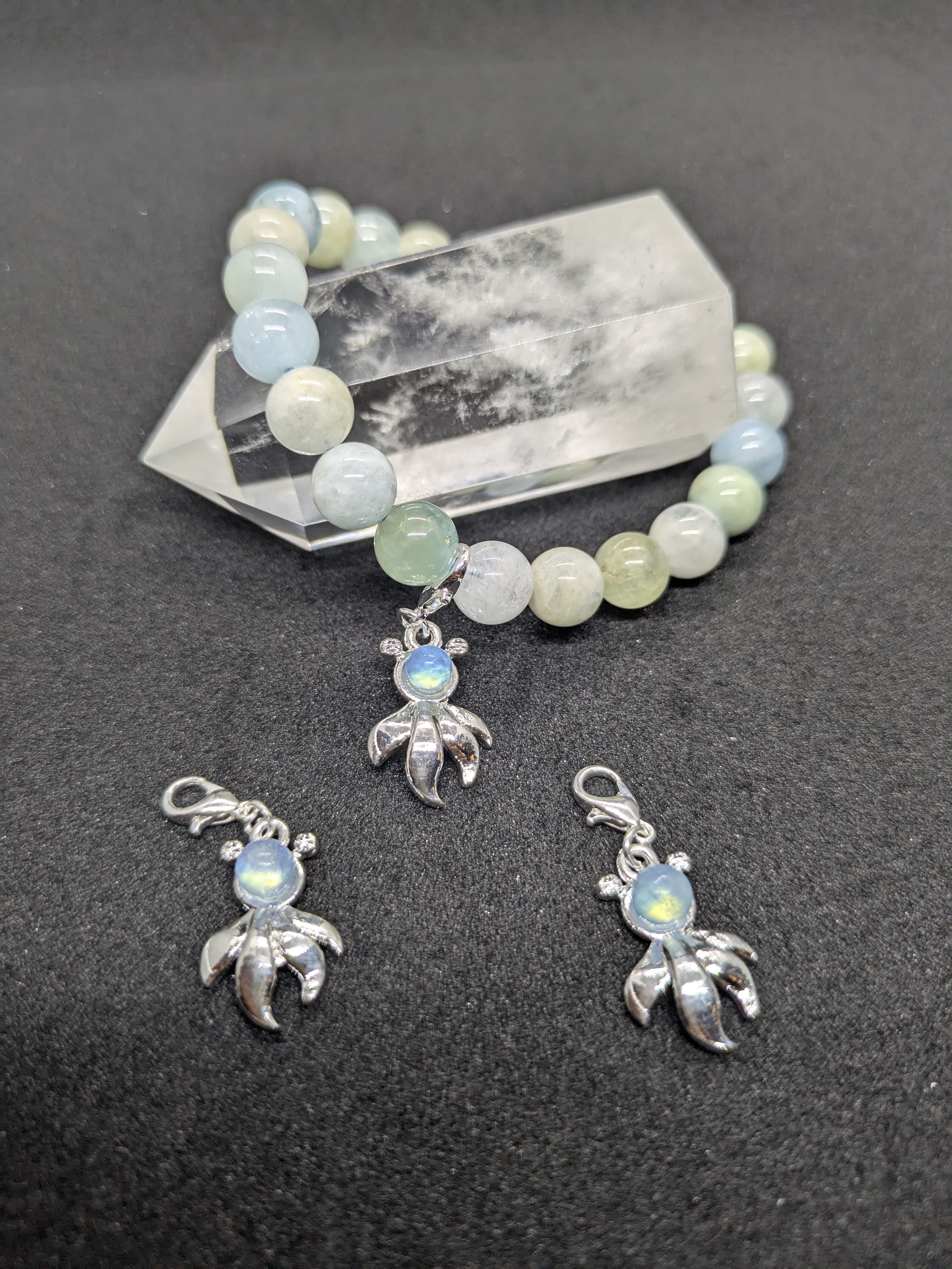 金魚型チャームは、天然石のアクアマリンを使用しており、目を引くデザインが特徴です。