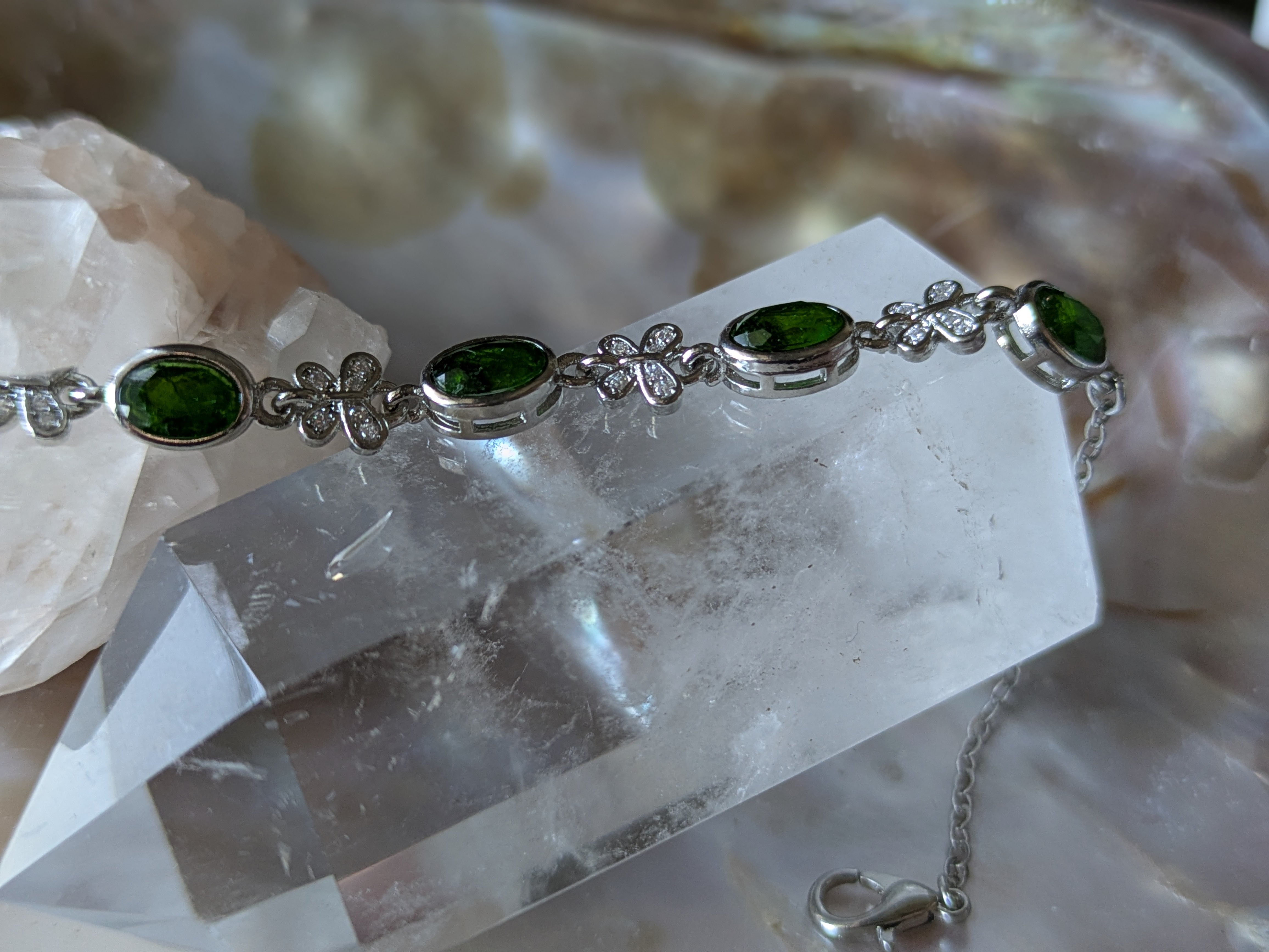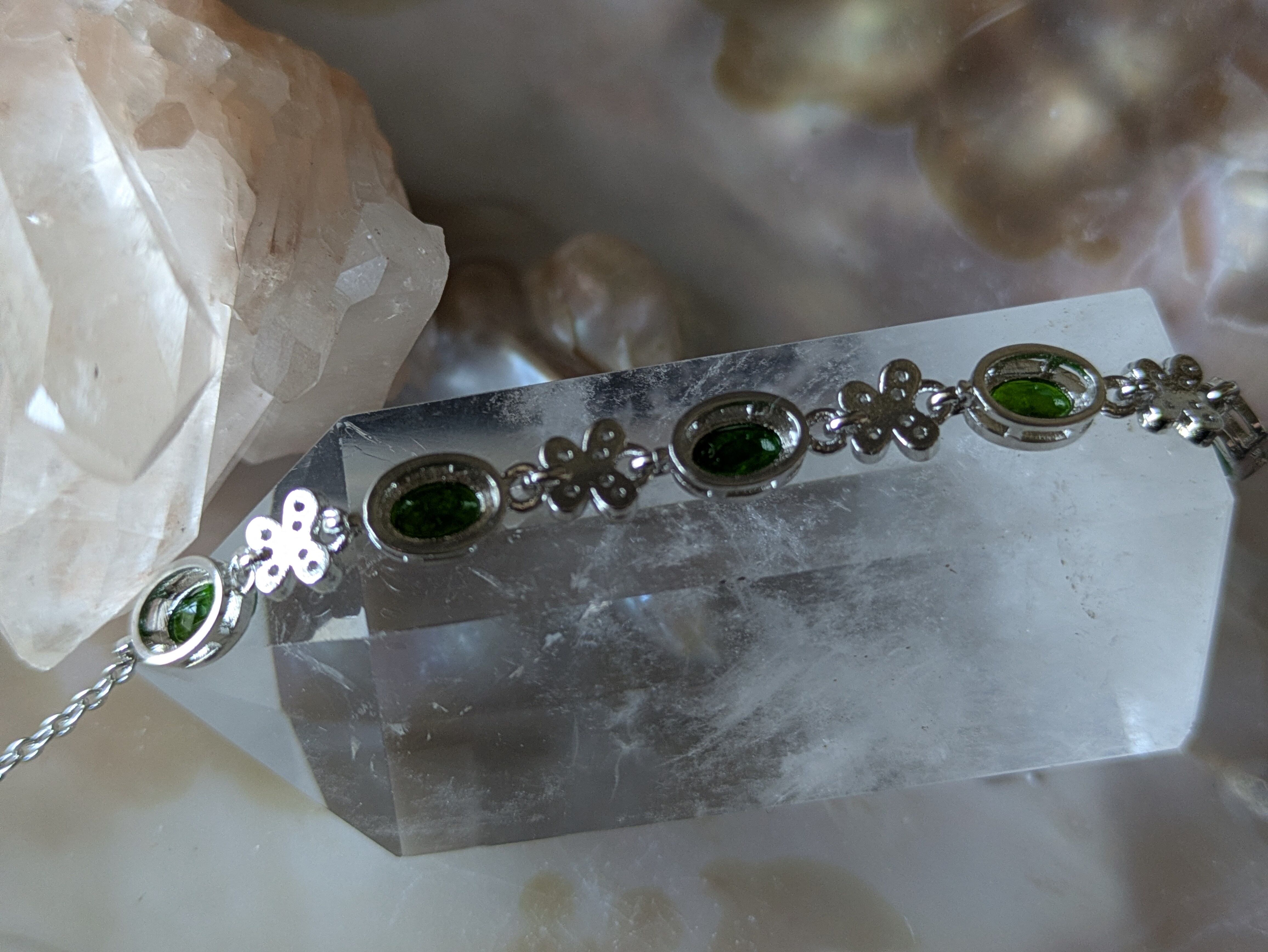 このブレスレットは、洗練されたデザインと共に美しいダイオプサイトが融合し、手元を華やかに演出します。