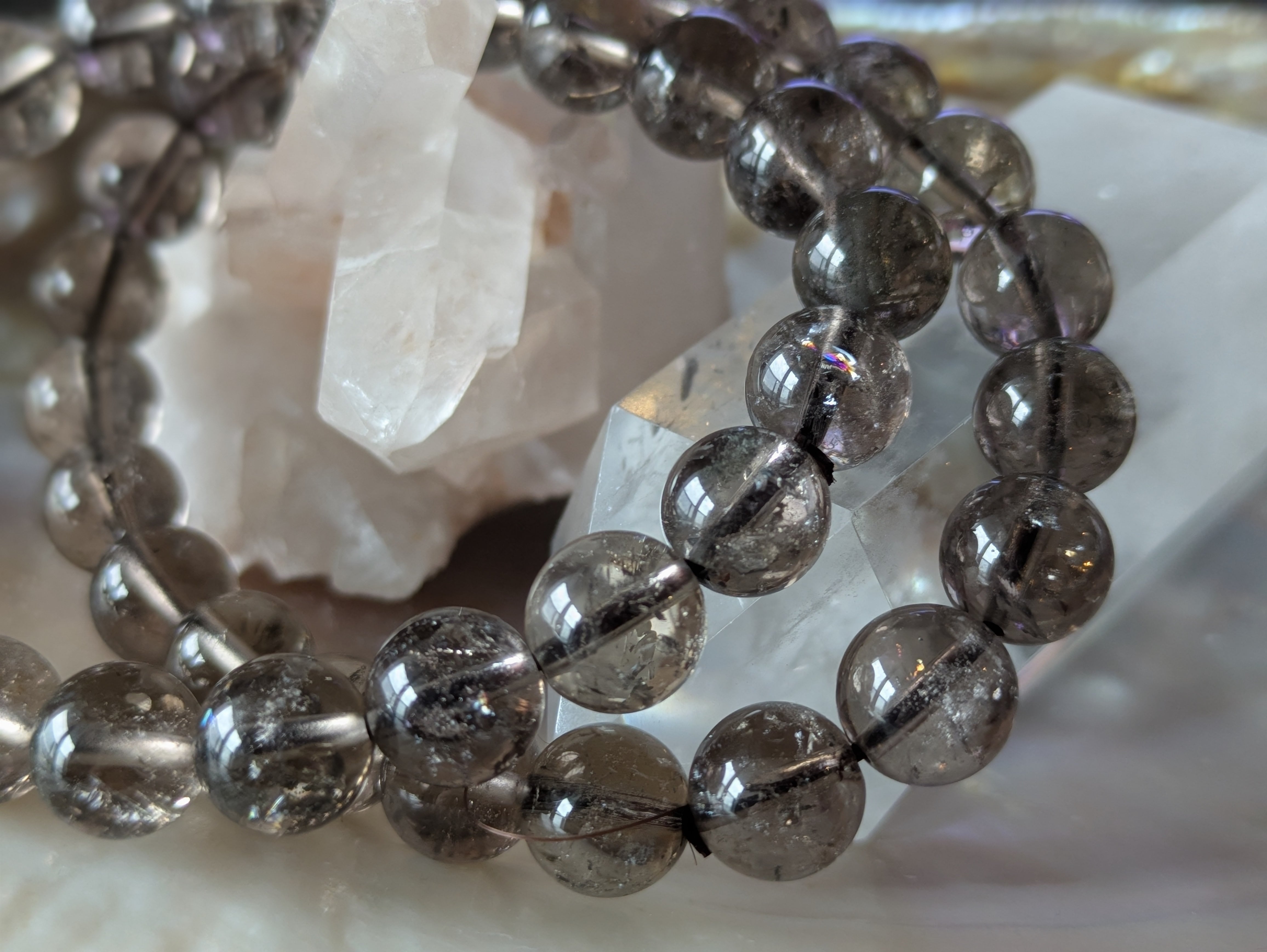 スモーキークォーツの安定と守りに、内側から現れる虹の光を持つ特別な石。