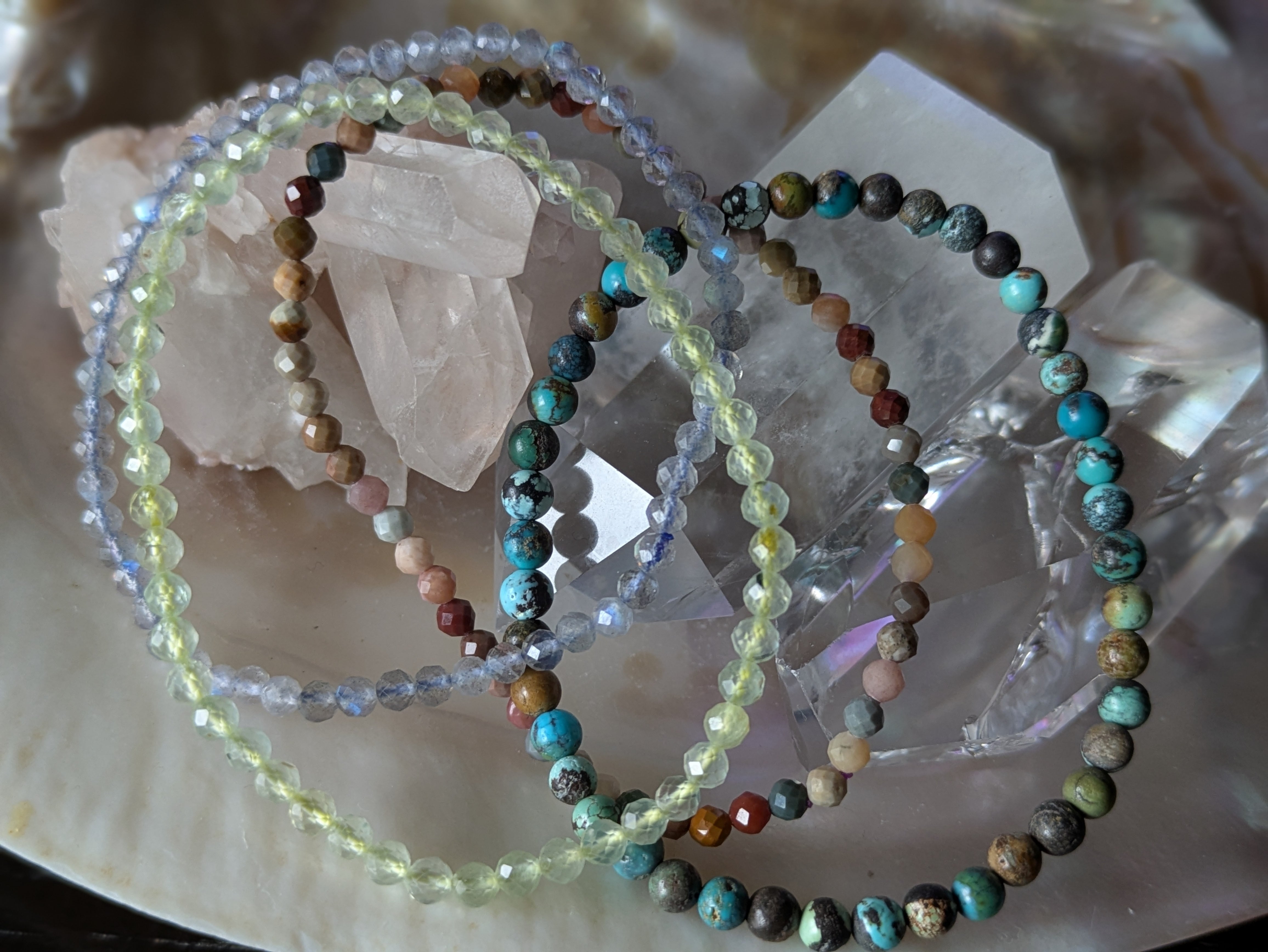 この4本セットは、ペリドット、ラブラドライト、アラシャン、ターコイズを使用した小粒の重ね付けにぴったりなアイテムです。