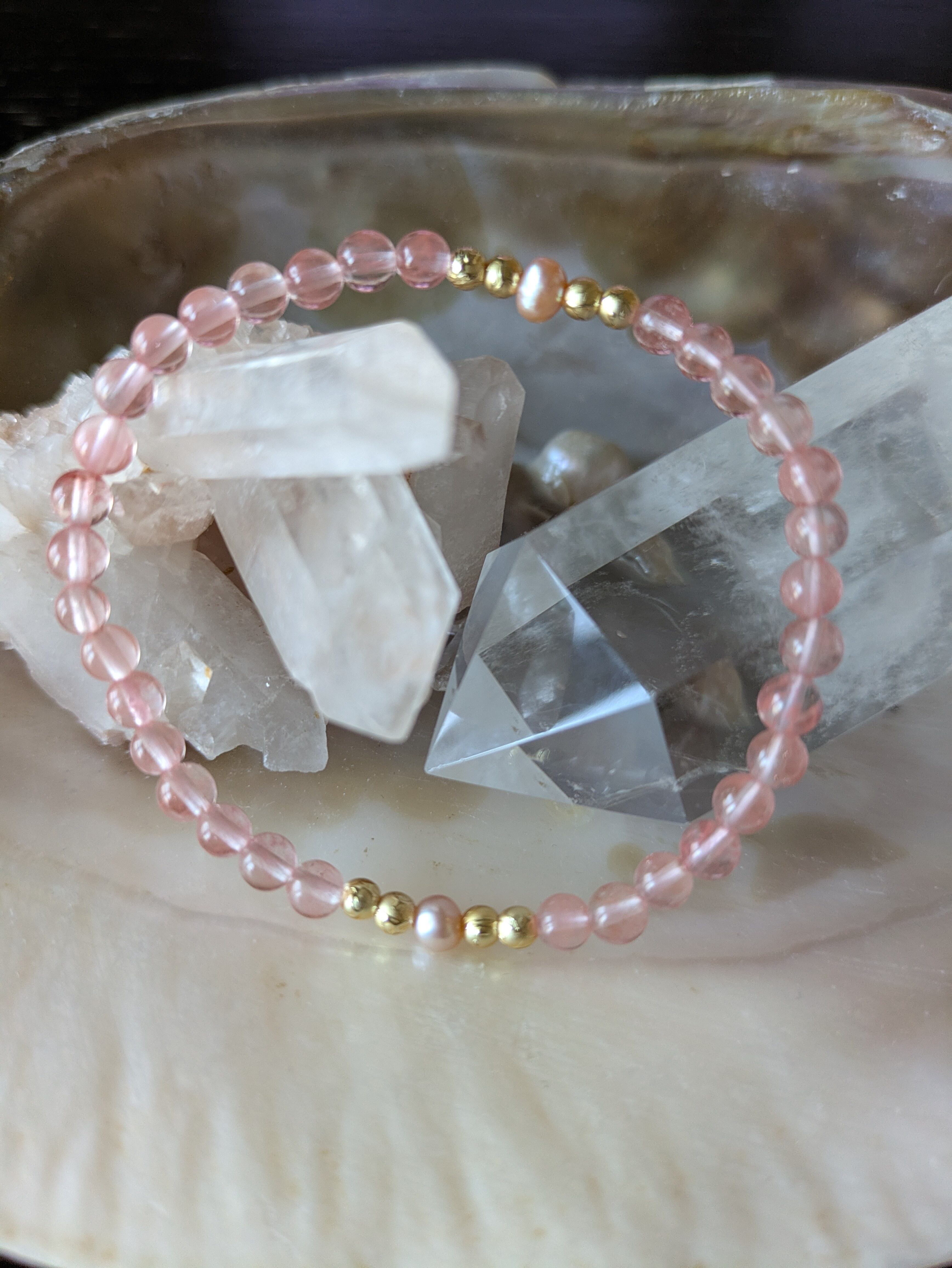 可愛らしいピンクの輝き、チェリークォーツ&淡水パールブレスレット